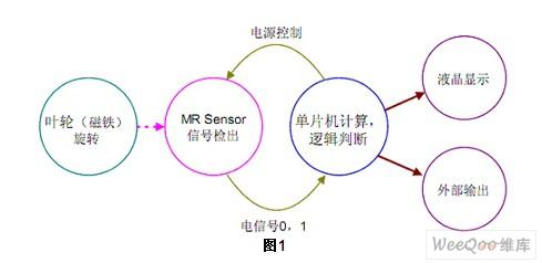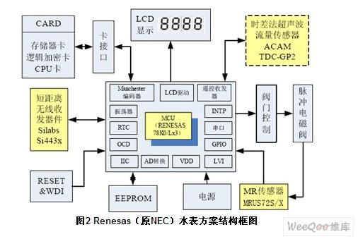 水表的電源一般由水表自行供給,這就對水表的功耗提出了苛刻的要求。國際規(guī)定,智能水表的靜態(tài)電流應(yīng)該小于30μA,實(shí)際中水表廠商都把該指標(biāo)控制在10μA以內(nèi)(使用干簧管傳感器時(shí)),保證工作時(shí)間大于6年以上才算合格。NEC帶LCD控制功能的8位微控制器以其低功耗、高性能等優(yōu)勢,成為水表微控制器的優(yōu)質(zhì)選擇。 1 NEC山梨MR和Renesas MCU水表方案 該方案的工作原理為:在葉輪上裝上磁鐵,由磁場感應(yīng)器(MR Sensor)感知出葉輪的旋轉(zhuǎn)。磁場感應(yīng)器(MR Sensor)把磁場信號轉(zhuǎn)變成電信號,再由單片機(jī)進(jìn)行計(jì)量的加法或減法運(yùn)算,運(yùn)算值由液晶顯示或?qū)ν獠枯敵。如圖1所示