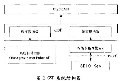 從圖1可以看出,它分為應(yīng)用層:系統(tǒng)層和加密服務(wù)提供層。處于應(yīng)用層的應(yīng)用程序通過Crypto API來調(diào)用CSP模塊提供的各種服務(wù)。 3 軟硬件結(jié)合的CSP開發(fā)
